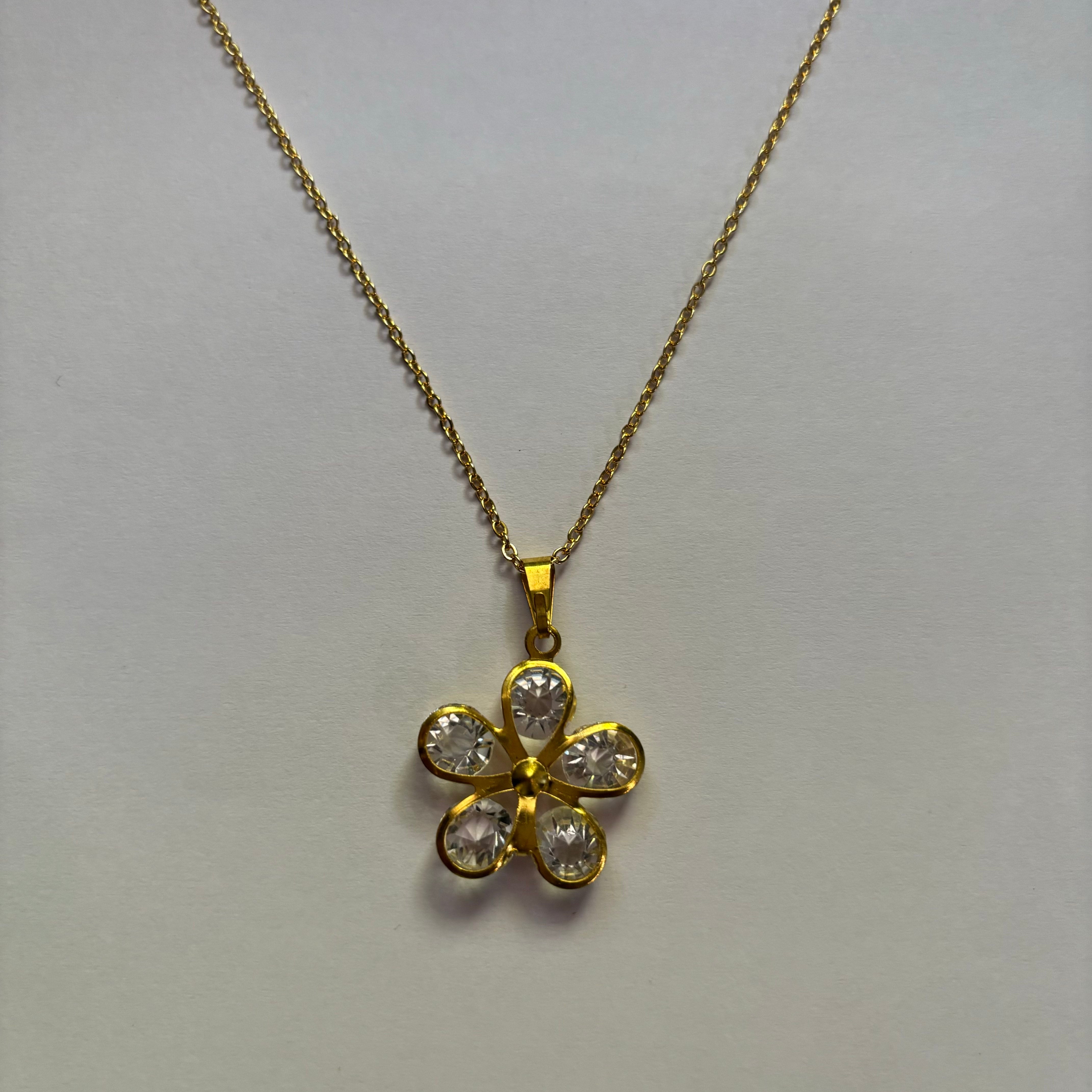 This elegant gold-plated necklace features a beautiful flower-shaped pendant adorned with shimmering crystal stones. The delicate chain adds a touch of sophistication, while the sparkling petals create a stunning, eye-catching look. Perfect for adding a hint of elegance to any outfit, this necklace is an excellent choice for both casual and special occasions.