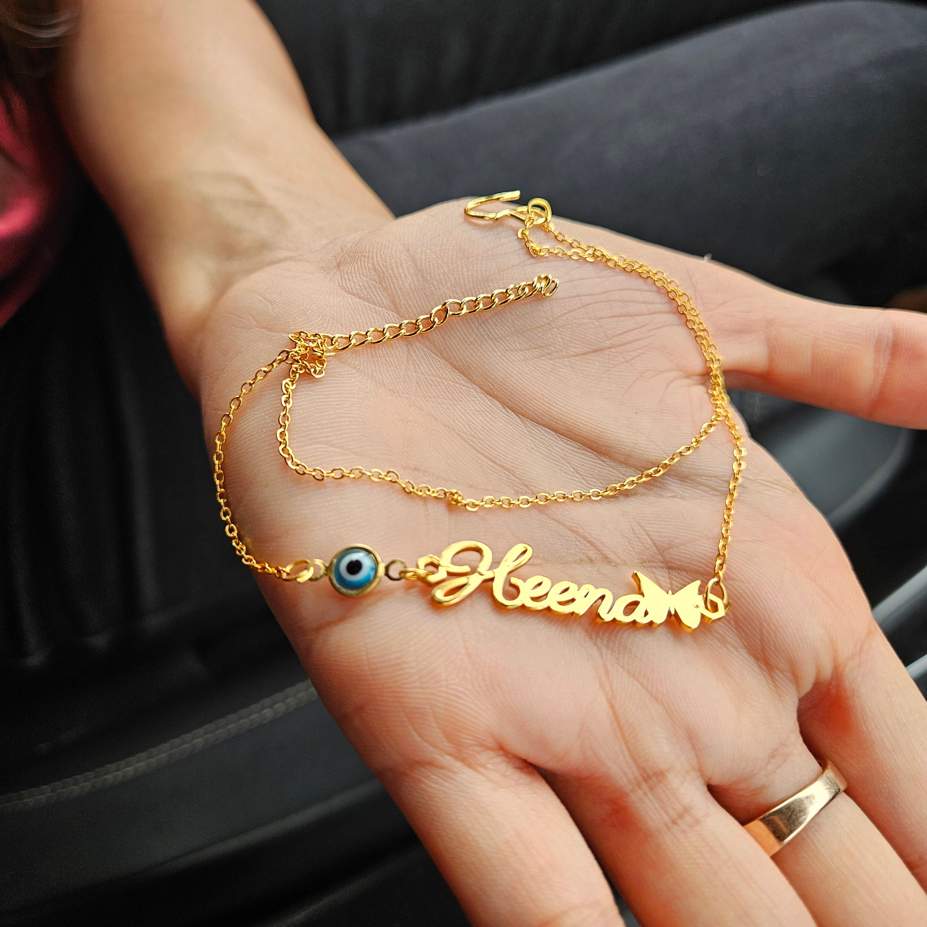 A beautiful Evil Eye Name Anklet with a tiny evil eye charm for protection from negative vibes. Stylish, lightweight, and made just for you.