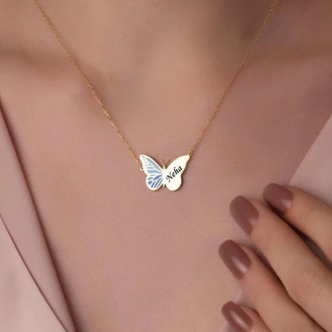 A unique piece that brings charm and elegance to your everyday style. Butterfly Engraved Name Necklace features a beautiful butterfly design with a delicate touch of color. Engrave your name or a loved one’s to make it a truly one-of-a-kind gift!