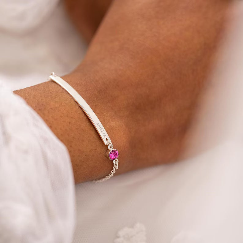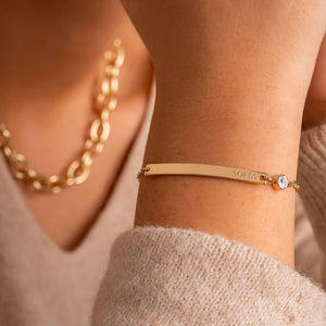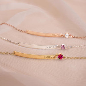 These Engraved Charm Bracelet combine modern elegance with meaningful sentiment. Featuring sleek, curved bars, each necklace is engraved with a name or special word, offering a unique and thoughtful way to celebrate individuality. The piece is accented with a sparkling gemstone, available in a variety of colors, to add a pop of personality and shine.